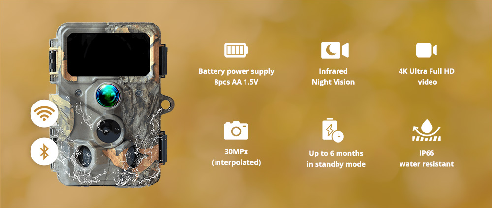 A WIFI-s Wachman Aldo vadkamera natív 4K videót és 30 megapixeles kristálytiszta fotókat rögzít, kiváló hangfelvétellel. Beépített WIFI-vel és alkalmazásvezérléssel rendelkezik – csak töltsd le a Hunting Camera 4K alkalmazást a mobilodra, és csatlakozz WIFI-n keresztül. Könnyedén beállíthatod a kamerát, előnézetet kérhetsz, vagy letöltheted a fotókat és videókat közvetlenül a telefonodra.