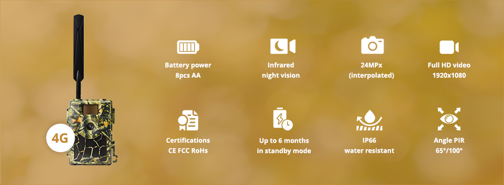 A beépített 4G modulnak köszönhetően a Wachman Rio 4G képes azonnal továbbítani a képeket és videókat a mobiltelefonodra, így valós idejű értesítést kapsz minden észlelt mozgásról. A kamera többféle képátviteli felbontást támogat: 640x480, 1920x1440, 5MP, 8MP és 12MP – a beállításaidtól függően. Ez a funkció tökéletes választássá teszi vadmegfigyeléshez, biztonsági alkalmazásokhoz vagy távoli területek megfigyeléséhez – mindig tudni fogod, mi történik a megfigyelt helyen.